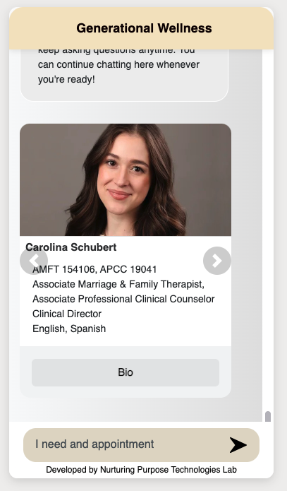 GenWell Agent’s purpose is to clearly communicate the organization’s mission, explain services, help users navigate therapy options, and support them in taking the next step toward care.